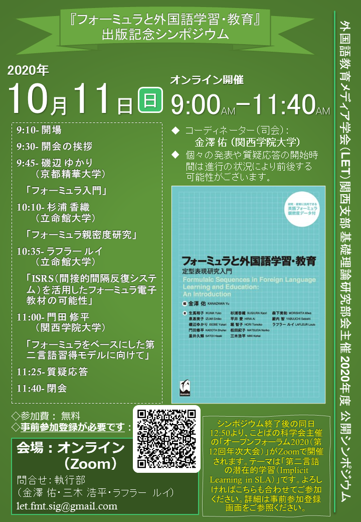 For information in English, please click on the following link: http://let-kansai-fmt-sig.blogspot.com/2020/09/publication-launch-symposium-october.html
